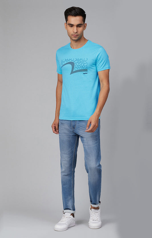 Light Blue Cotton Printed Round Neck T-Shirts- UnderJeans by Spykar