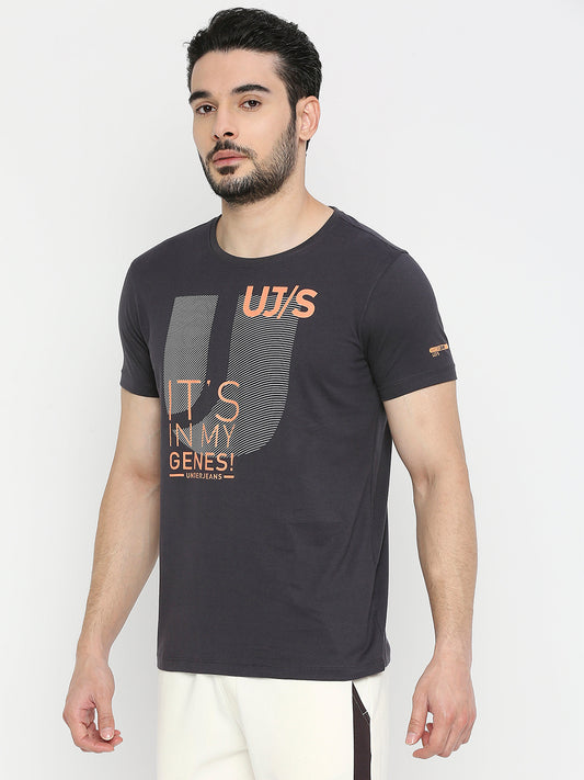 Men Slate Grey Cotton Round Neck Printed Tshirt- UnderJeans by Spykar