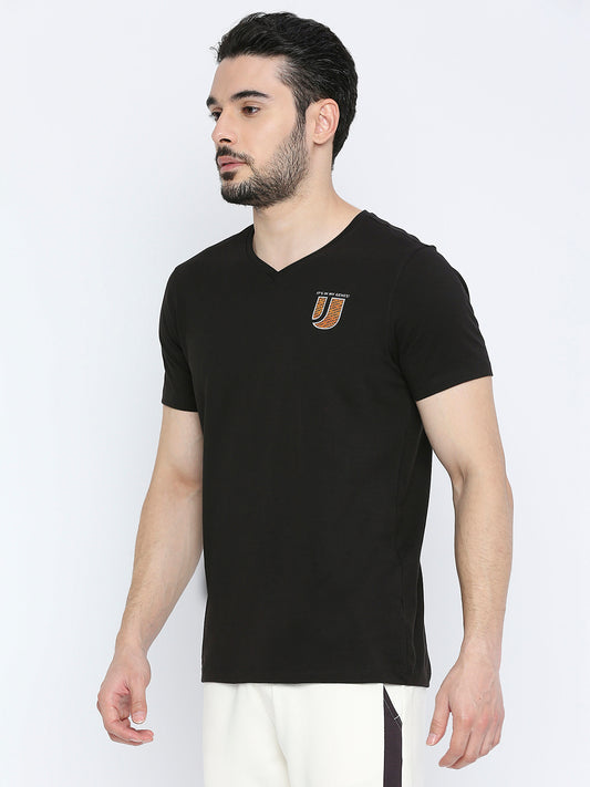 Men Black Cotton V-Neck T-shirt- UnderJeans by Spykar