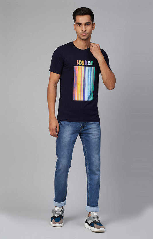 Navy Cotton Printed Round Neck T-Shirts- UnderJeans by Spykar