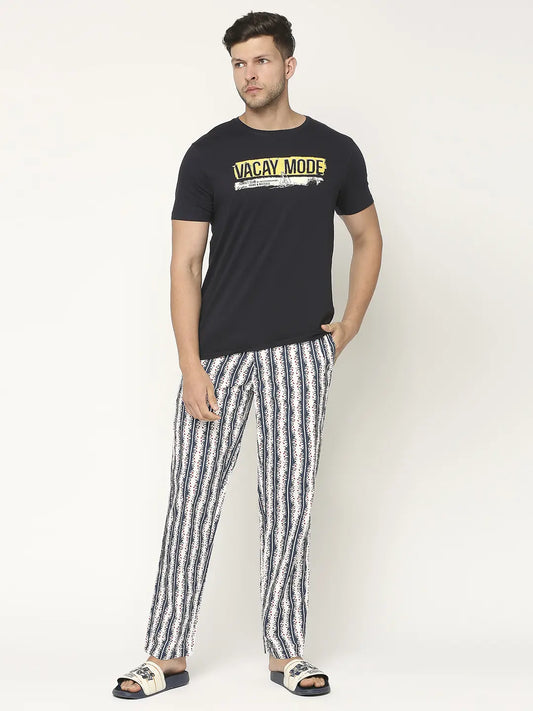 Men White & Dark Navy Cotton Printed Pyjama - UnderJeans By Spykar
